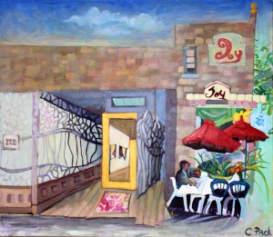 In reality, the restaurant is on a corner of Queen Street East with the outside patio facing the side street on the west. At the time, there was a rather ugly open space between the bistro and the gallery on its right. …. The artist has attached the bistro to the right of the gallery and has cleverly made the focal point of the painting the strong yellow door in the lower third of the canvas, just off-center. The diagonals lead us into the doorway to which contrasting paintings on the interior wall arrest our eyes. The wrought iron grill work is well observed and the wonky angles do not matter. Can you not just imagine sitting in those plastic chairs with a glass of pino on a sweltering day! Well, well done!!