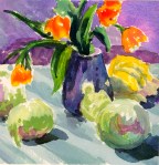 By Mid-winter we gathered at my house for a framing workshop. I had had courses in mat cutting and owned all the equipment necessary, the Logan mat cutter etc. We purchased full sheets of museum quality, acid-free mat boards (many framing shops do not necessarily bother to provide a product of this standard!). The solid wood frames came from Victor Gallery on Queen West. We chose the compositions, assessed the best mat size, bevel cut the board openings, hinge-matted with acid-free linen tape ( that means the art work never touches anything not acid-free), cleaned the glass, assembled the matted piece within the frame, checked for any specks, attached work to frame with a point driver, added a dust cover backing and screwed in the loops for the hanging wire. … Maybe this is more than you want to know about framing, but this is the process that is necessary to protect works on paper.