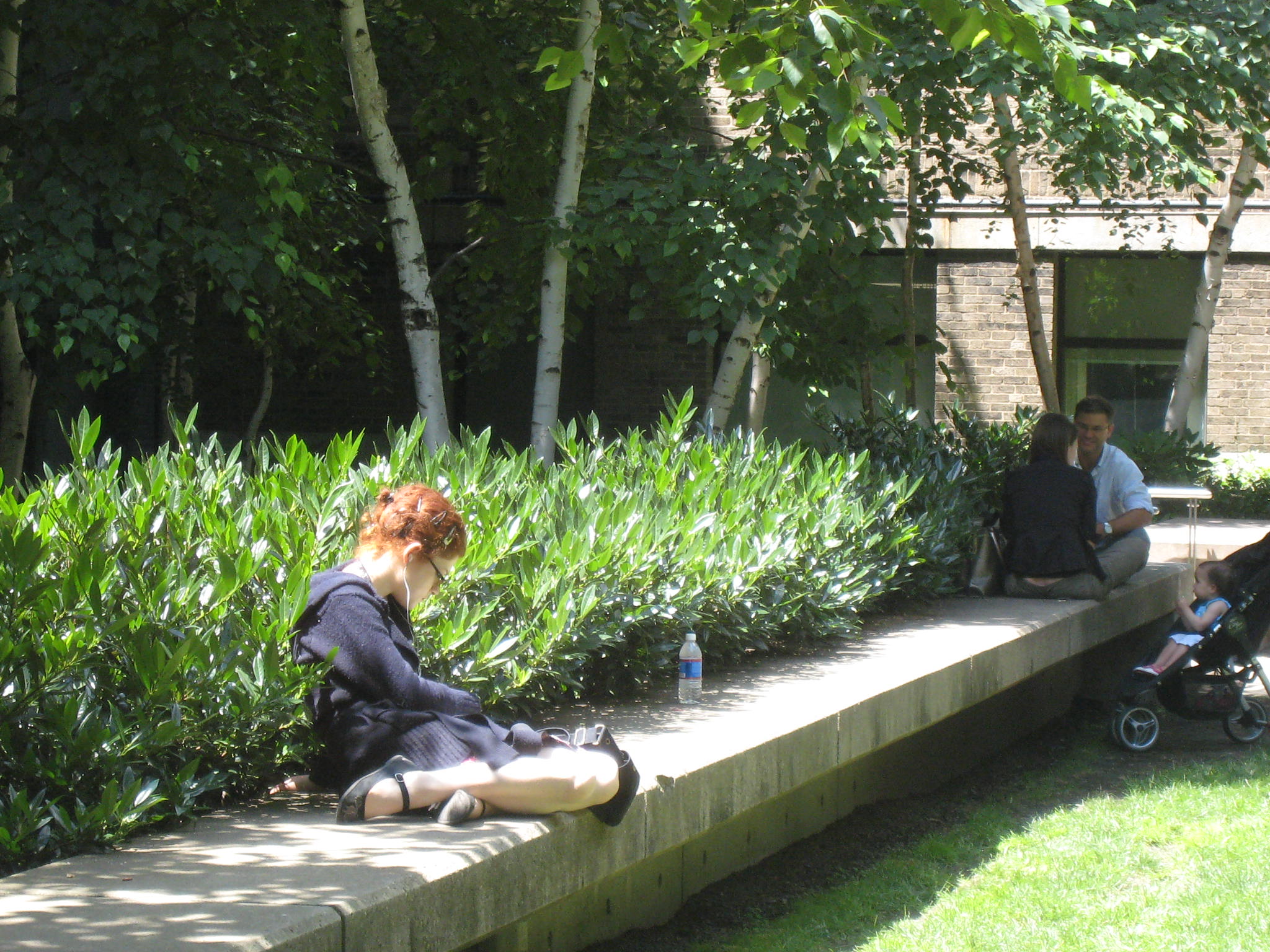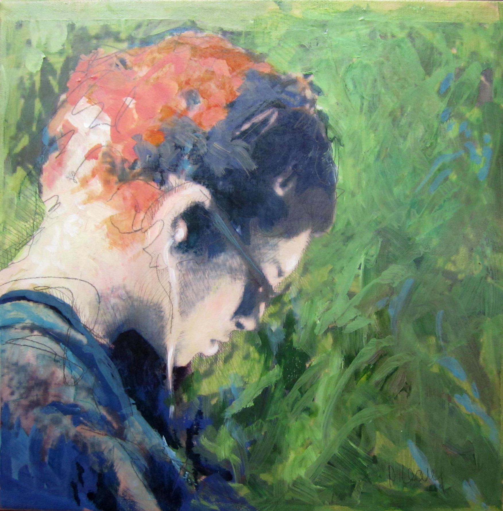 In last year’s show I exhibited “Laura’s Barns” from Advocate, Nova Scotia. Again, this year I did an exploration of one subject in different media. On a trip to Boston, I took a photo of an unknown girl who was reading and listening to her iPod in the outdoor courtyard of the Museum of Fine Arts. I just liked her mood and posture and thought that one day I would use that photo for a painting. Here is the original: