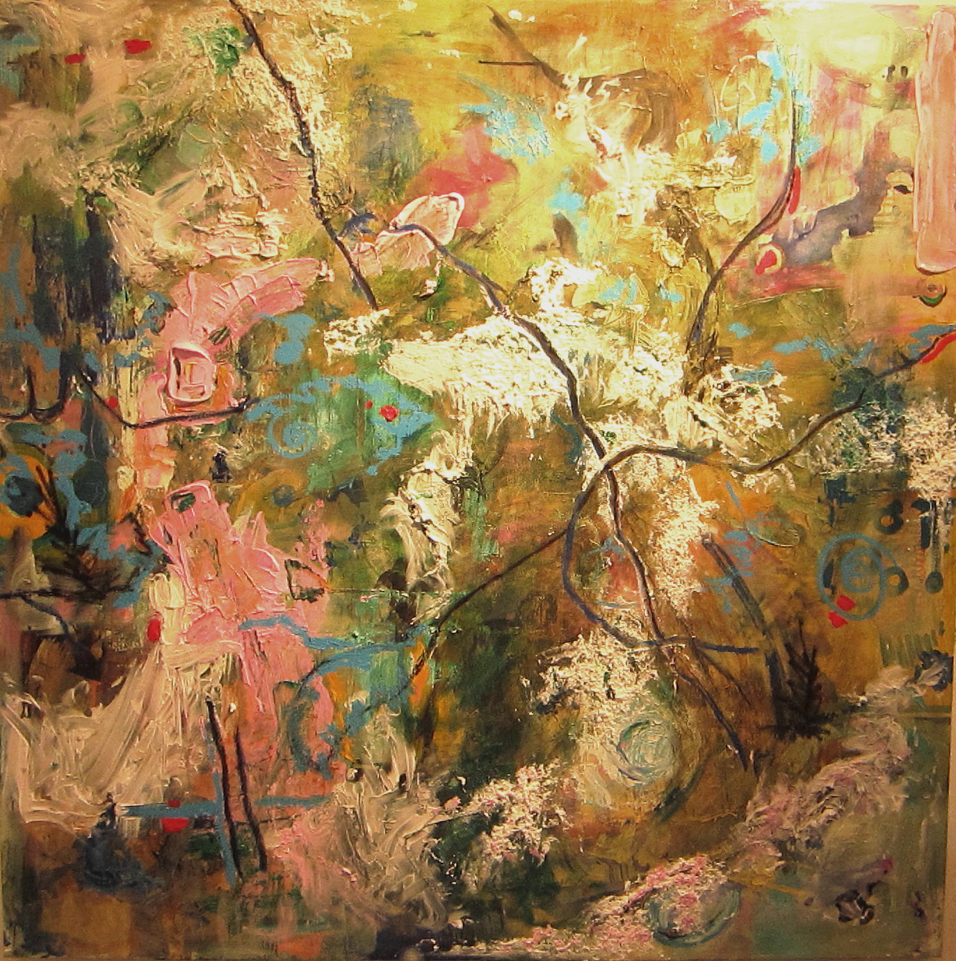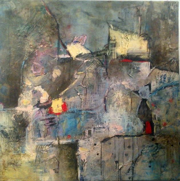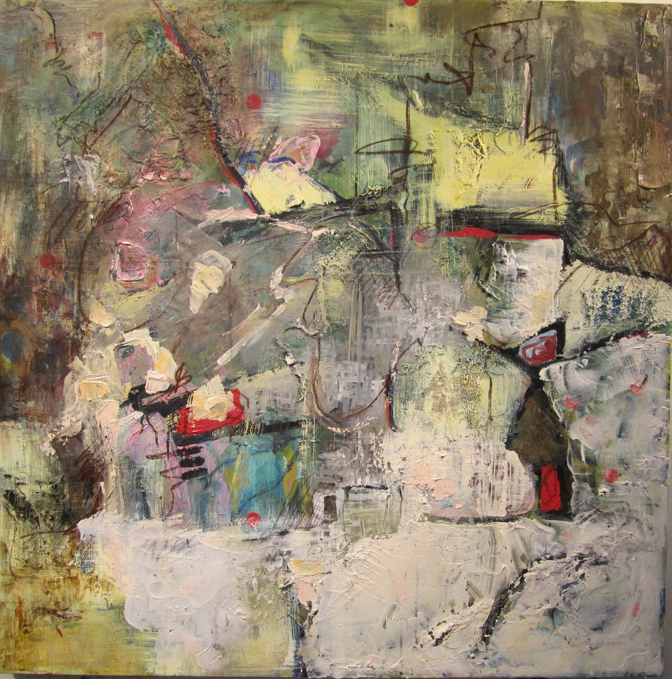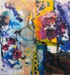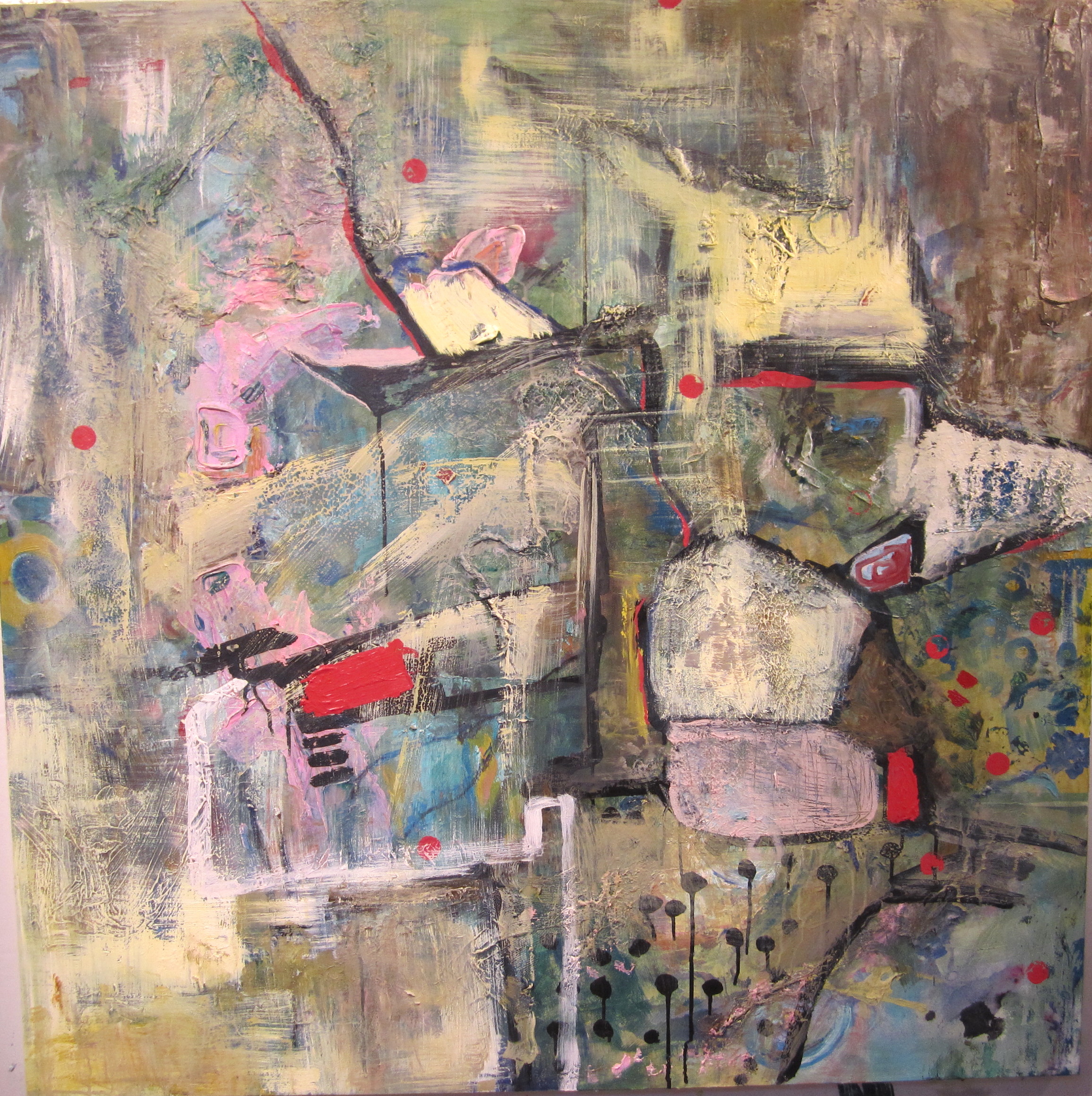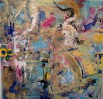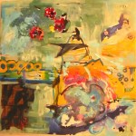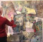 The Fall 2012 session of Project: Art has been an exciting one! Ewa Stryjnik, our director (impressario, teacher, magic wizard!) presented us with an interesting challenge. “Let’s explore Post Modernism!” She went on to explain that she would provide for each class a 4 ft x 4 ft canvas on which we as a group would make a painting. As an exploration in an art expression, our end product would be an “anonymous” collective effort to which we all contributed our individual strengths and styles, thus removing the concept of artist as individual. Preconceived ideas and barriers should be shattered! Emotion and sensation should replace planning and deliberation, resulting in a spontaneous, anarchical painting. Keep reading to see how this process led us to the paintings above …