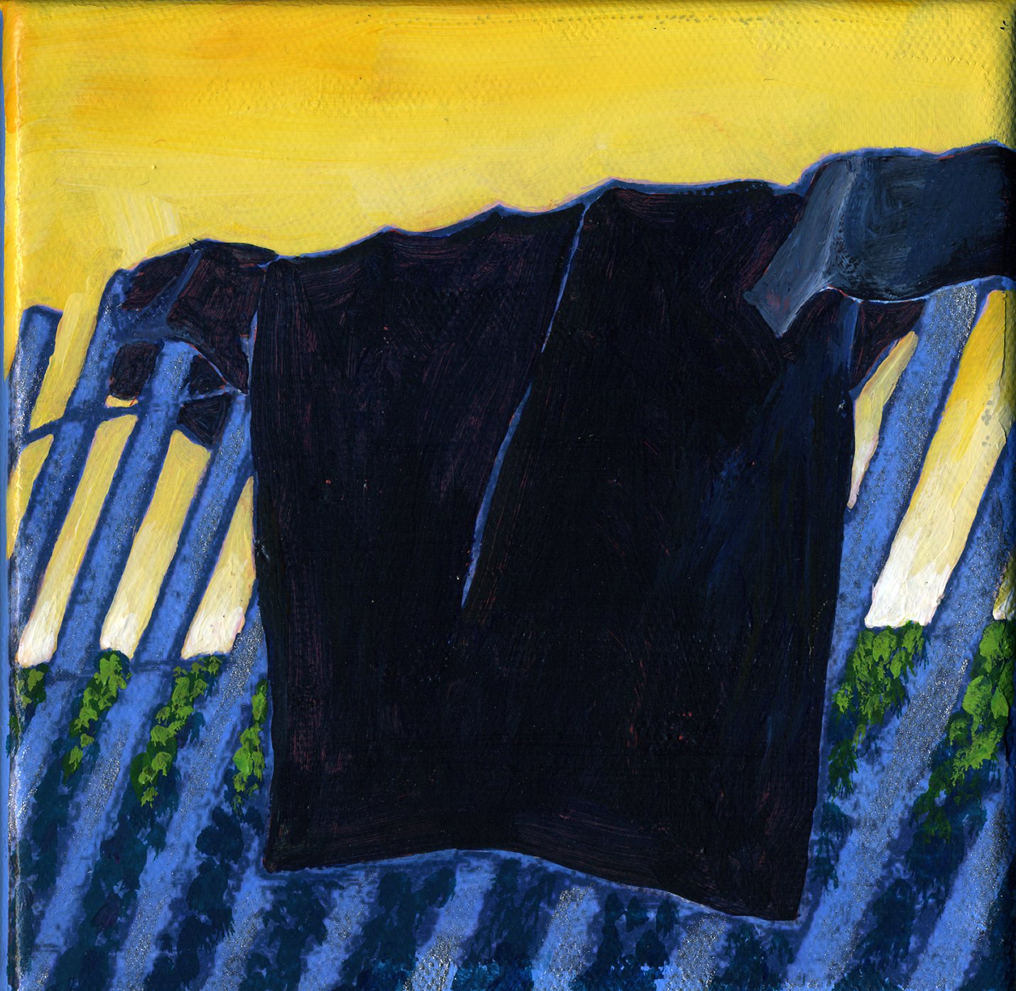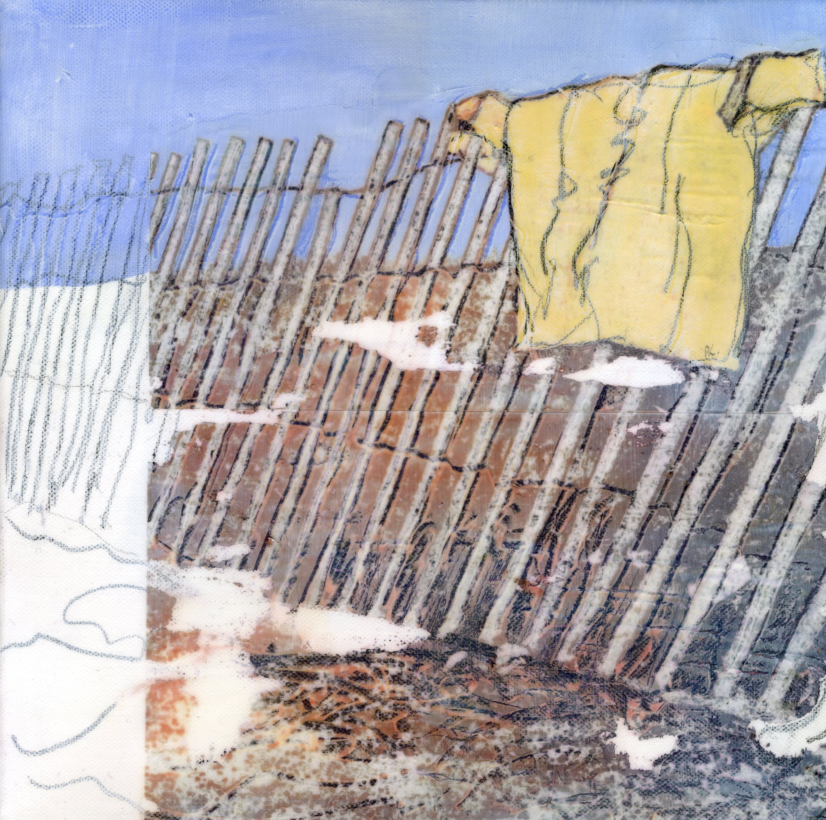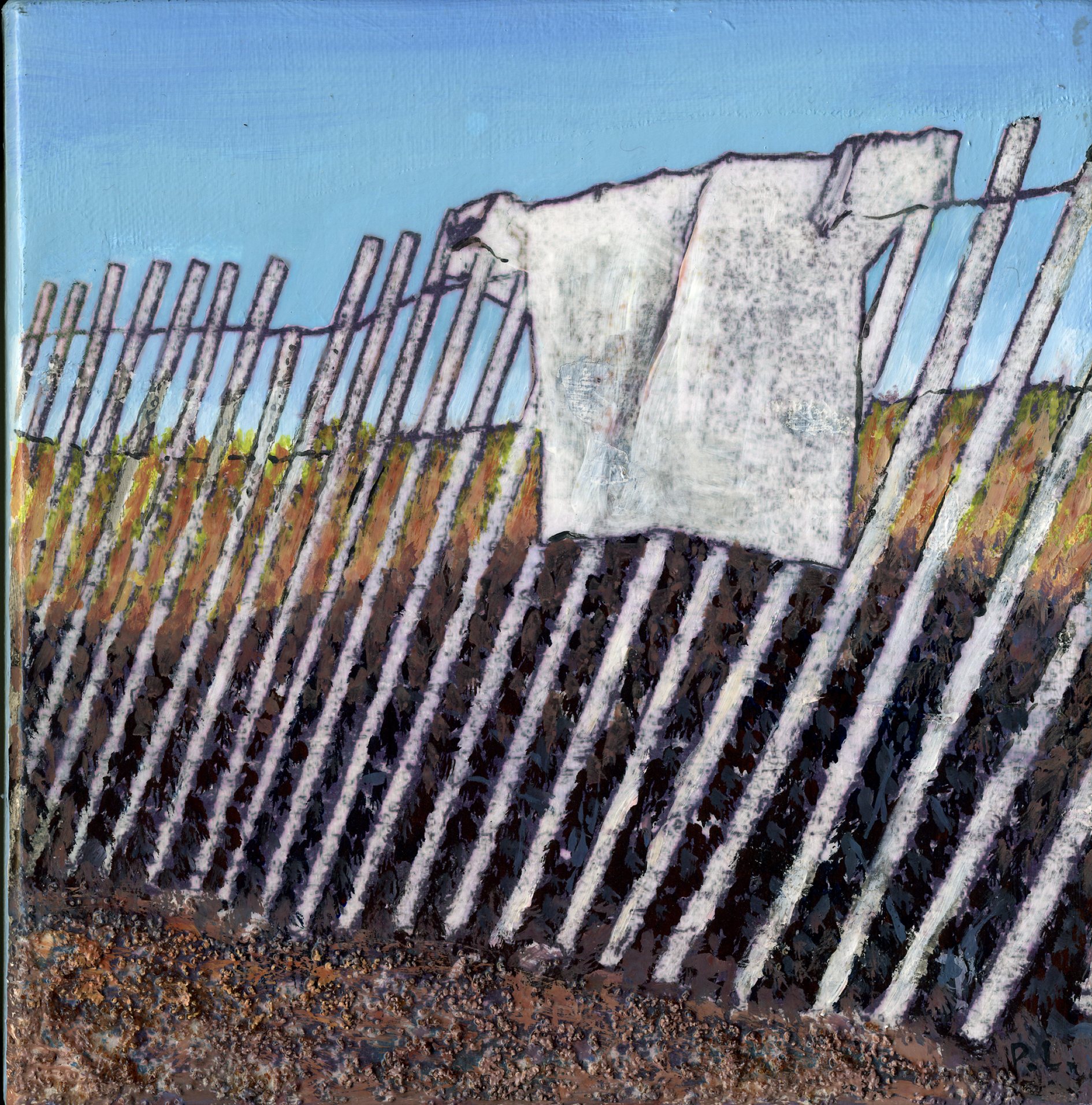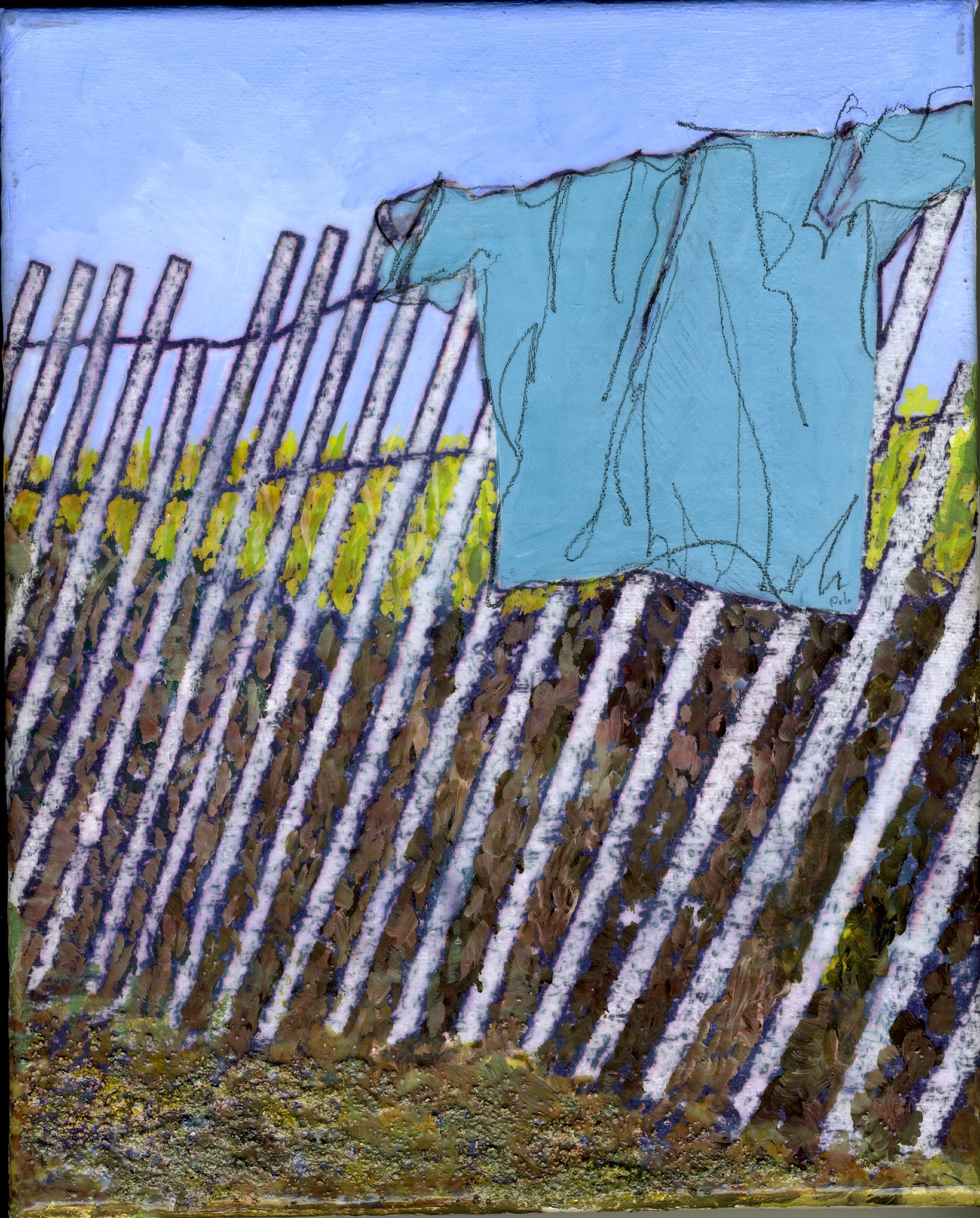 The image of the T-shirt drying on the beach fence is a metaphor of longing … for the salt air, warm sand, cool water, clear skies, hot sun and lazy hours of stunned relaxation.