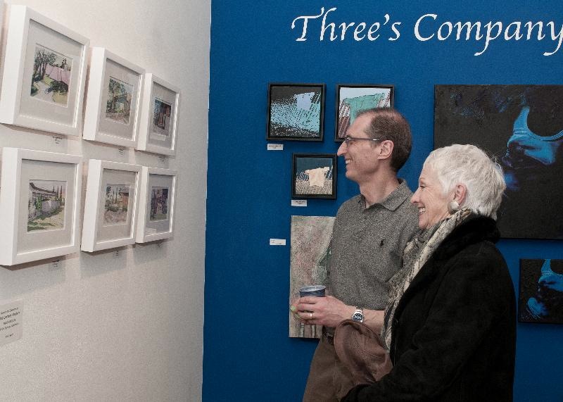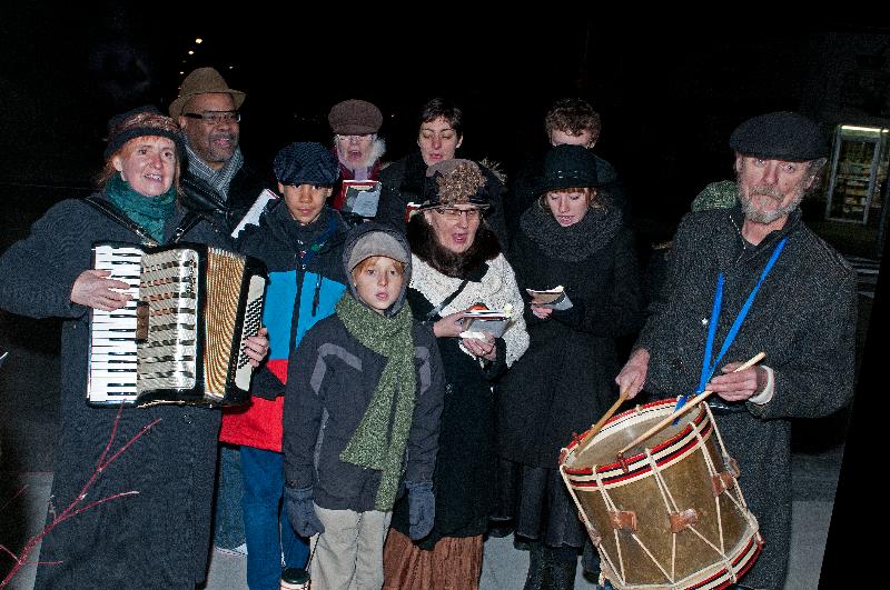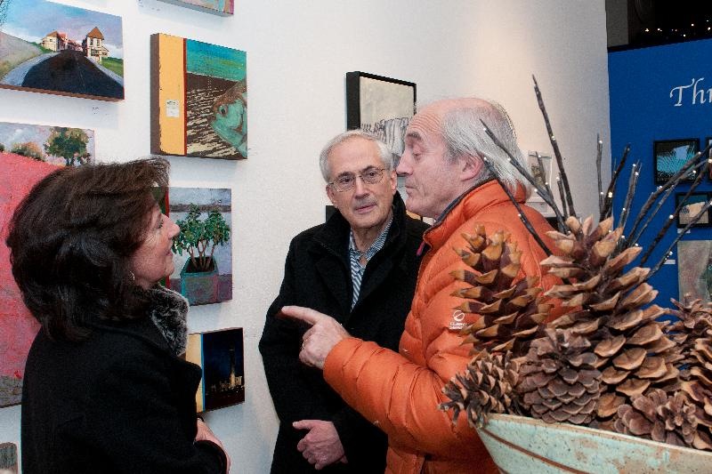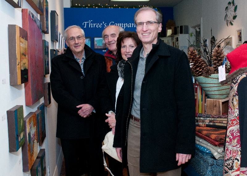 After 5 months, the Three’s Company Show with Liz Russ and Lee Goldman is coming to a close at the end of December. (There is still time to see these wonderful art pieces!) … Meanwhile, we had our final reception on the 6th of December to coincide with the opening of traffic on Kingston Road, the former grand route from Toronto to Kingston. The temperature cold, the night jolly; Toronto event photographer, Patrick Jubé, was fortunately present to immortalize the evening. Could this scene of the carolers outside the gallery door be more wonderful? Come in and see the event!