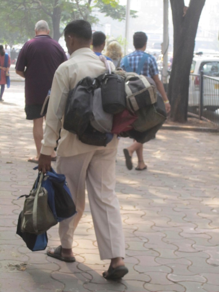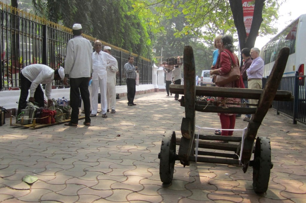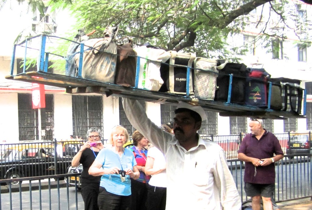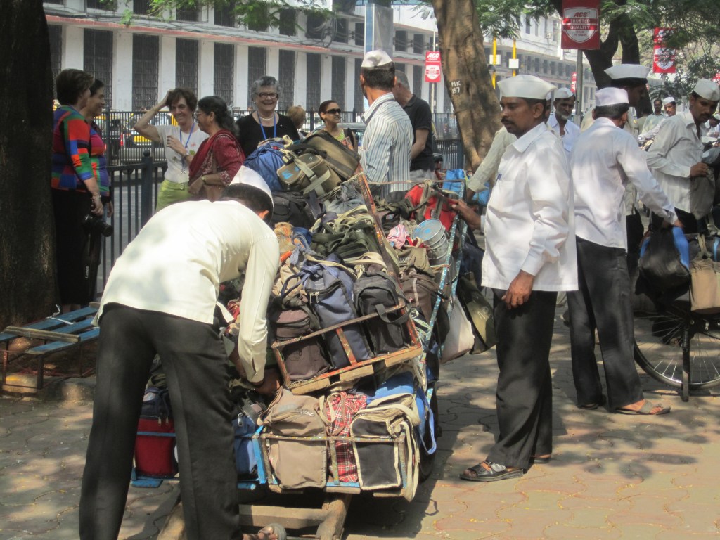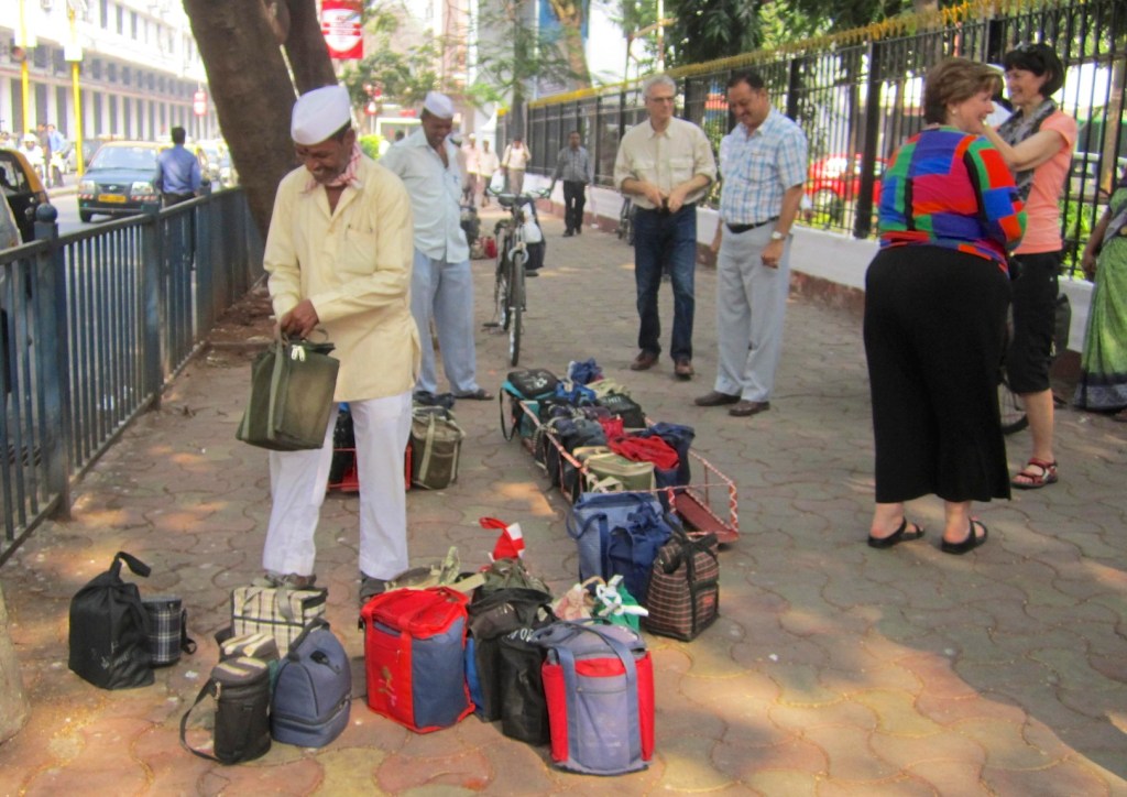 A “dabba” is a tin lunchbox called a tiffin, which is a series of stacked metal containers. A “walla” is a worker. So, the Dabbawalla is the lunch delivery man. Simple as that! … When we were taken by our guide to the Central train station to see the Dabbawallas, none of us had any idea about what we were soon to witness. A small army of men in impeccable white hats was carrying 8 to 10 foot long trays loaded with a disheveled collection of insulated bags and tiffins. (Click on picture to start slide show.)